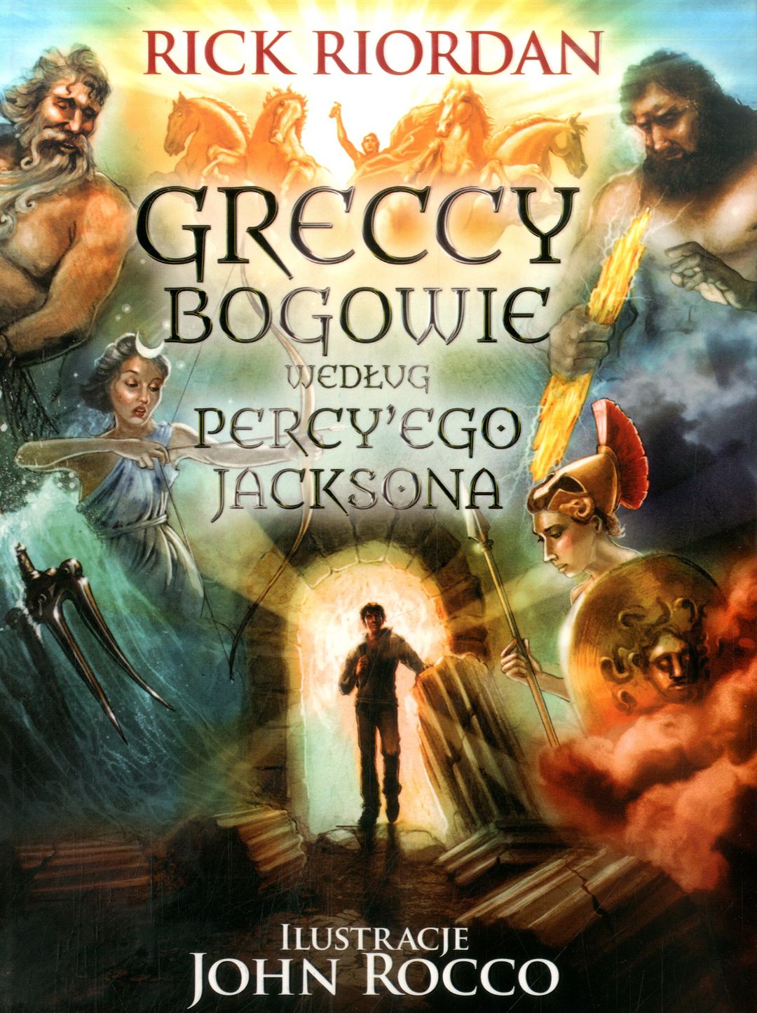 Kto lepiej niż współczesny heros opowie o pochodzeniu bogów olimpijskich? W tym ilustrowanym zbiorze opowieści Percy Jackson przedstawia spojrzenie od środka, pełne osobistego zaangażowania."Pewien wydawca w Nowym Jorku poprosił mnie o spisanie tego, co wiem o greckich bogach, ale ja byłem ostrożny: - Nie moglibyśmy napisać o tym anonimowo. W sumie nie chciałbym znów wkurzyć Olimpijczyków.Gdyby jednak wiedza o greckich bogach miała kiedyś pomóc wam przeżyć spotkanie z nimi, jeśli się przed wami pojawią, to może spisanie tego wszystkiego będzie moim dobrym uczynkiem tygodnia".Tak zaczynają się Greccy bogowie według Percy’ego Jacksona, książka, w której syn Posejdona dodaje do klasycznych opowieści własną magię - oraz sarkastyczne uwagi. Wyjaśnia, jak został stworzony świat, a następnie przekazuje czytelnikom osobistą opowieść o tym, kto jest kim wśród starożytnych, od Apollina po Zeusa. Percy nie cofa się przed niczym. "Jeśli macie ochotę na mnóstwo kłamstw, kradzieży, ciosów w plecy i kanibalizmu, to czytajcie dalej, bo właśnie tego jest mnóstwo w Złotym Wieku".Pełne dramatyzmu kolorowe ilustracje, które wykonał John Rocco, gwarantują, że książka będzie niezbędna w każdym domu, bibliotece i klasie. Jest nie tylko przyjemna w lekturze, ale również wspaniale się prezentuje.